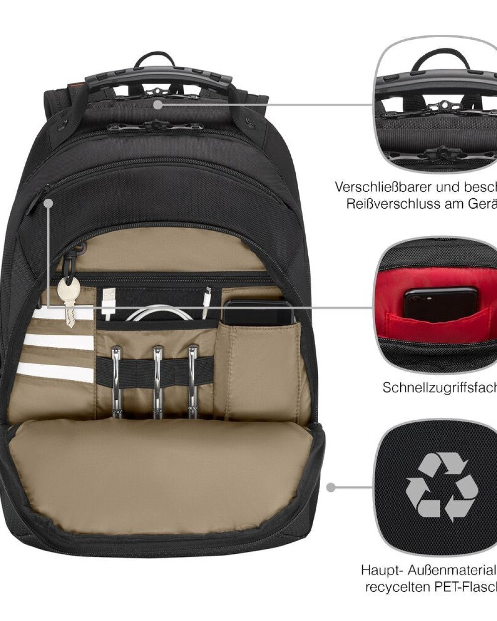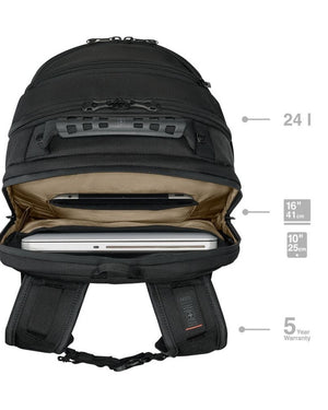 Elevate your daily commute with the Legacy Black Series Laptop Backpack.With a robust outer material from recycled PET bottles, it is designed for busy professionals. The Triple Protect padded compartment with lockable and coated zippers fits laptops up to 16", while the dedicated pocket holds a 10" tablet. Enjoy comfort with air-flow back padding and shock-absorbing shoulder straps. The QuickAccess pocket stashes your most-used items, while the hidden security pocket keeps valuables safe. With the Pass-Thru trolley strap and CaseBase stabilizing platform, traveling becomes a breeze.