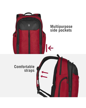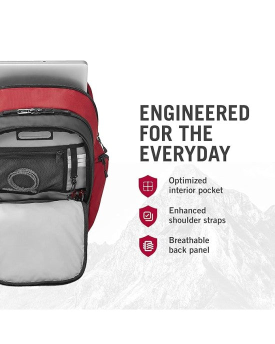 Neoprene pocket on shoulder strap to keep your Swiss Army Knife at hand Zippered mesh pocket, key fob, pen holder, name tag, two accessory pockets and elastic USB device holder With enhanced shoulder straps and back padding for maximum comfort, clever air channels, a trolley pass-through and a hidden back...