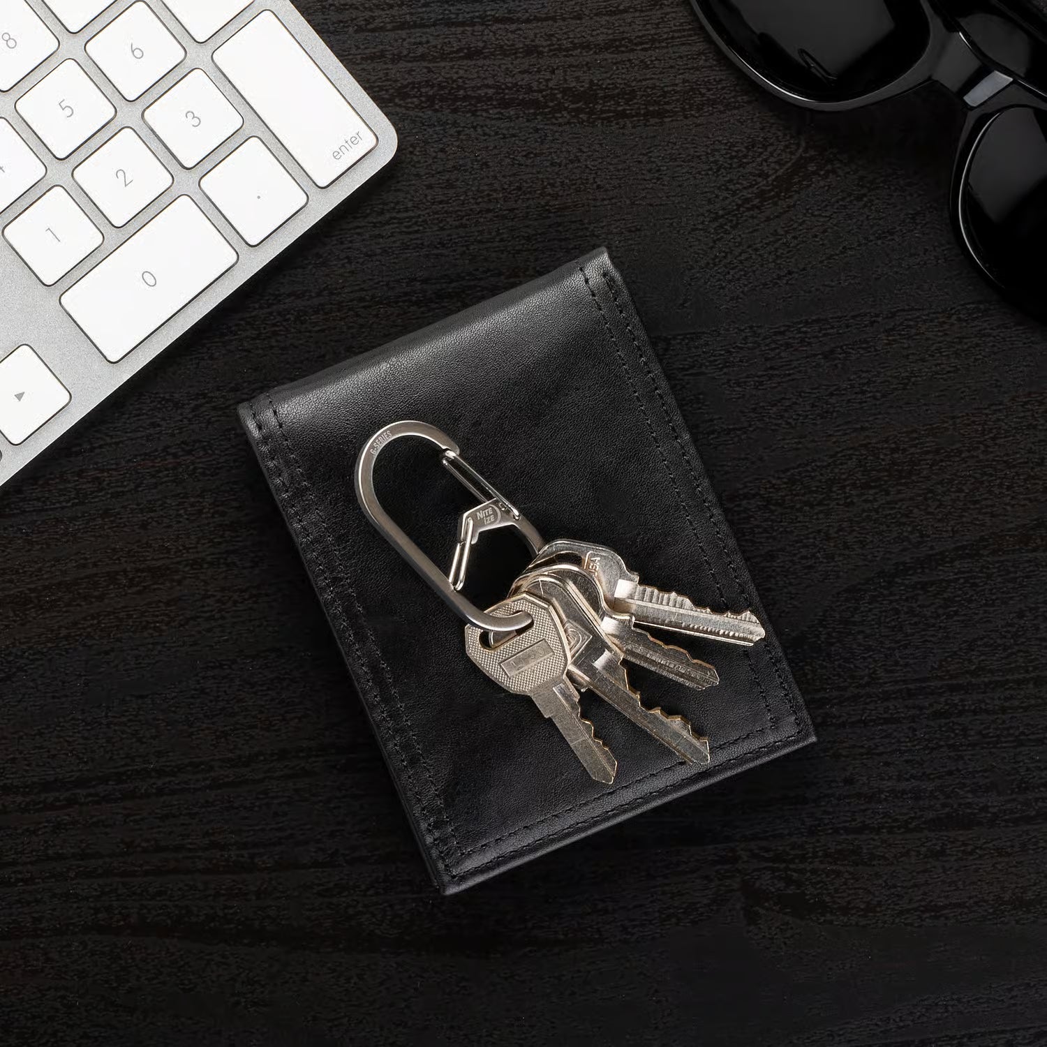 Made of stainless steel carabiner with double compartment. When the first chamber is opened, keys and hanging accessories are still safe thanks to the closed second compartment.