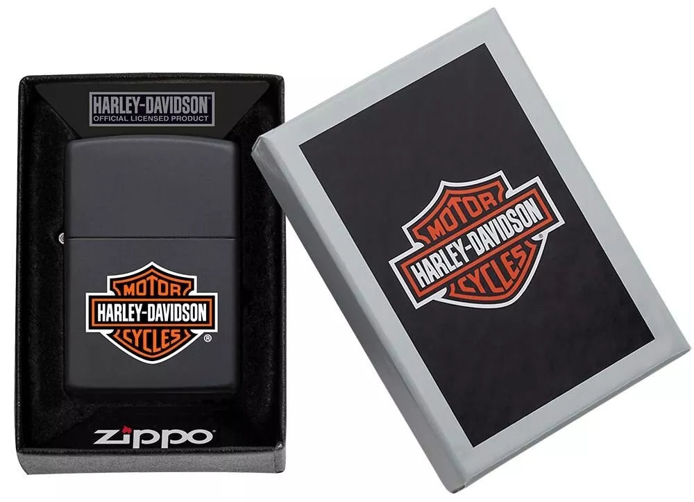 Zippo Harley Davidson logo on matte black a classic zippo lighter with classic Harley Davidson logo an official zippo lighter. Sleek and sophisticated. High and refillable. With gift box