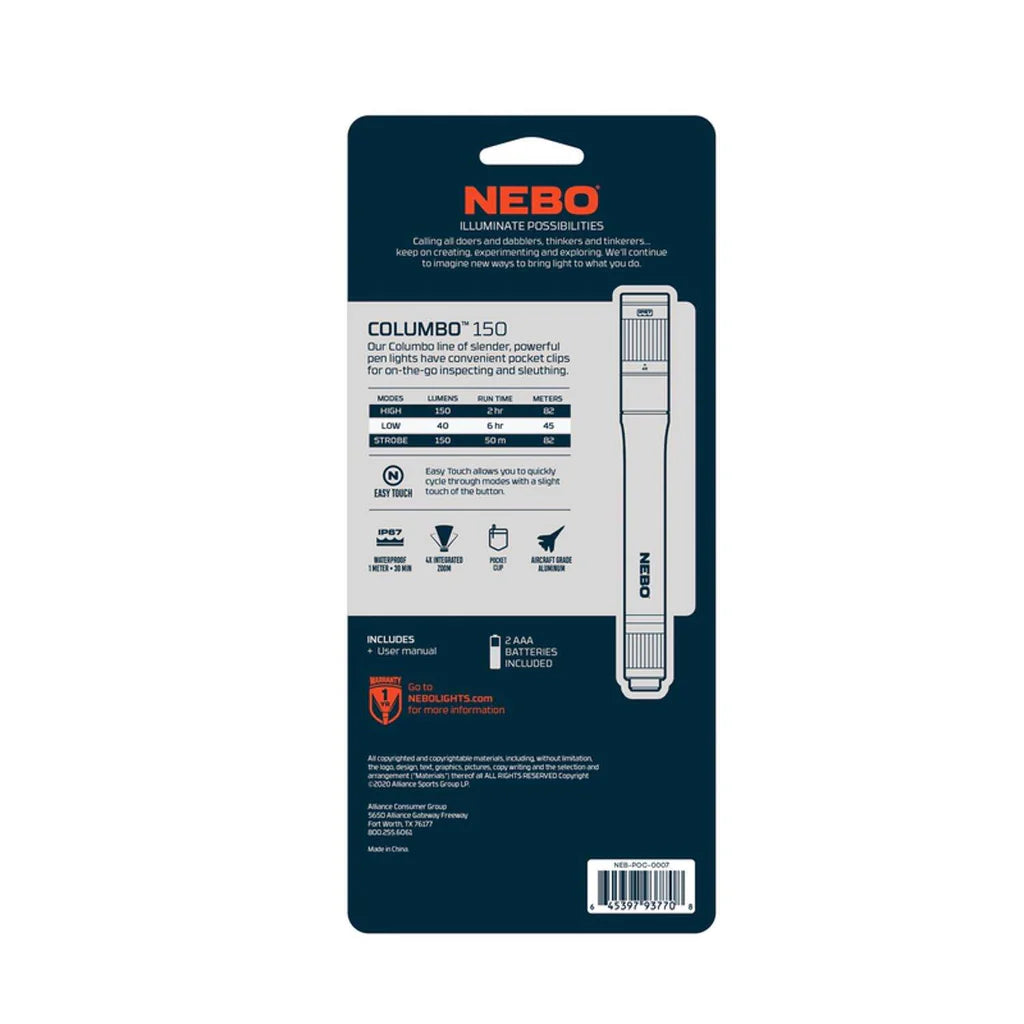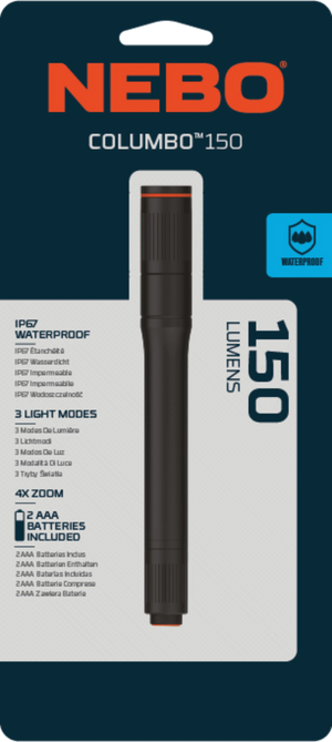 The COLUMBO™ 150 pen light features a 150 lumen LED, 3 light modes, 4x adjustable zoom, Easy Touch Technology, strong steel clip, and a waterproof (IP67) anodized aircraft-grade aluminum body. The included AAA alkaline batteries allow for up to 6 hours of operation. LIGHT MODES High (150 lumens): 2 hours...