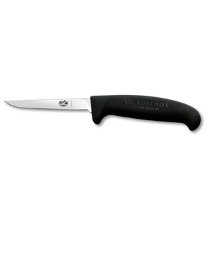 The Victorinox poultry knife features a small black Fibrox® Pro handle that offers a firm, slip-resistant grip for delicate trimming work. Its 3-inch blade is made of high-carbon stainless steel, providing durability and consistent sharpness in busy prep environments. Designed with a slanted tip, the straight-edge blade supports precise vent boning around poultry joints and tight areas.