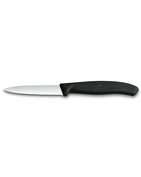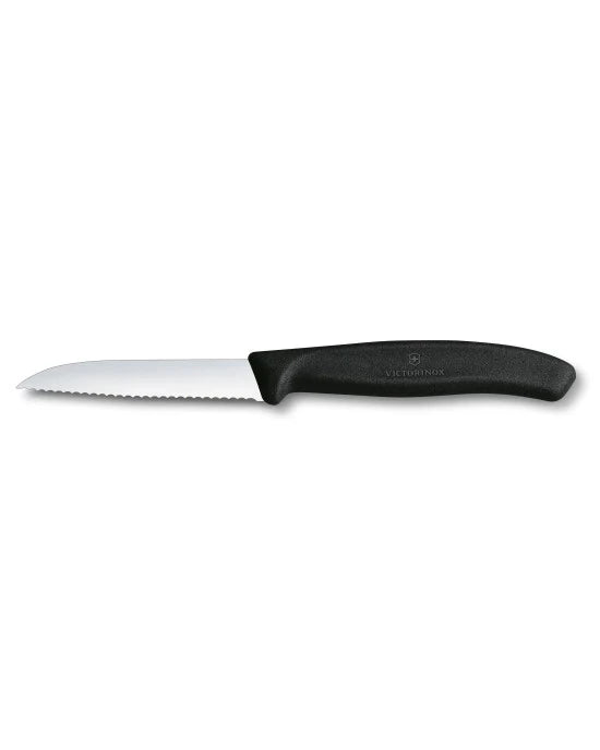 Paring Knife with Wavy Edge and Pointed Tip This Paring Knife features a professional sharp stainless steel blade with a wavy edge and pointed tip, ideal for a wide range of precise prep tasks. Its lightweight, ergonomic handle is designed to provide optimal comfort and control. Swiss made and dishwasher...