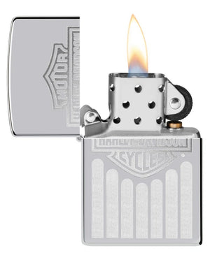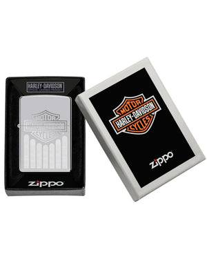 This classic High Polish Chrome lighter features the Harley-Davidson® logo in a stunning combination of our Lustre and Color Image processes. Comes packaged in a gift box. For optimal performance fill with Zippo lighter fuel. Genuine Zippo windproof lighter with distinctive Zippo "click" All metal construction; windproof design works virtually anywhere...