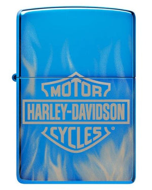 The classic Harley-Davidson logo emerges from a white-hot inferno on this High Polish Blue lighter. Dancing flames envelop the entire piece thanks to our Photo Image 360 process. Comes packaged in a gift box. For optimal performance fill with Zippo lighter fuel. Genuine Zippo windproof lighter with distinctive Zippo "click"...