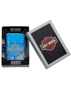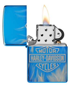 The classic Harley-Davidson logo emerges from a white-hot inferno on this High Polish Blue lighter. Dancing flames envelop the entire piece thanks to our Photo Image 360 process. Comes packaged in a gift box. For optimal performance fill with Zippo lighter fuel.