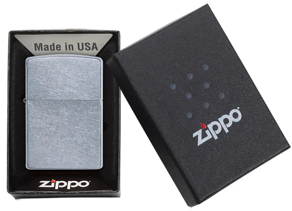Introduced in 2001, the Street Chrome™ lighter has a random 'distressed' look, giving the lighter a pocket-worn look even when new. The entire surface of the lighter, including the sides and bottom, has been tumbled in a special media to replicate the random scuffs and scratches of a beloved, well-used lighter.