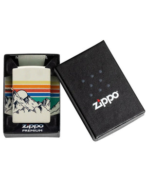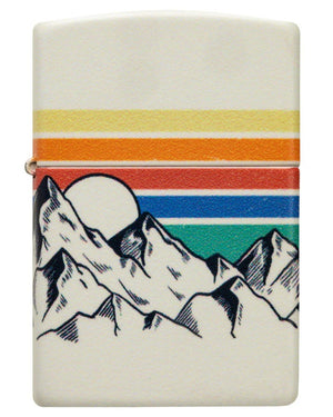 Take to the trails and wide open air with this modern and minimalist 540 Color lighter. The monochromatic mountainscape is backed by a colorblocked sunset in this serene design, which seamlessly covers all sides of this adventurous keepsake. Comes packaged in a gift box. For optimal performance, fill with Zippo...