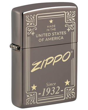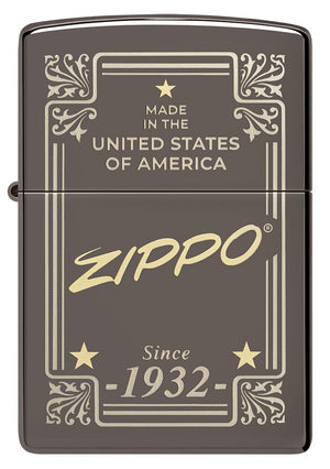 Details This stunning Black Ice® lighter is as classic as it gets. A vintage Zippo logo appears between the inscription "Made in the United States of America since 1932", while an intricate border completes the timeless two-tone laser design. For optimal performance, fill up with Zippo lighter fuel. Genuine Zippo...