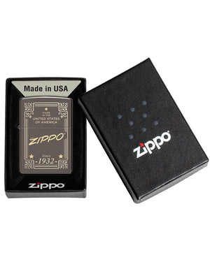 This stunning Black Ice® lighter is as classic as it gets. A vintage Zippo logo appears between the inscription "Made in the United States of America since 1932", while an intricate border completes the timeless two-tone laser design. For optimal performance, fill up with Zippo lighter fuel.