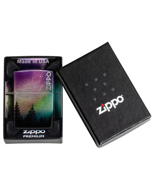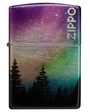A stunning aurora sprawls and swirls around all surfaces of this mesmerizing 540 Fusion lighter, anchored by a stoic treeline. The Zippo logo adorns the lid in tumbled chrome tones for subtle contrast. Comes packaged in a gift box. For optimal performance, fill with Zippo lighter fuel.