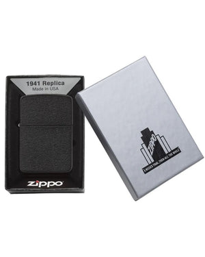 This Black Crackle 1941 Replica case has flat planes with sharper, less rounded edges where the front and back surfaces meet the sides. Lid and the bottom are joined with a four-barrel hinge. Inside unit is flatter, with squared edges where they meet the front and back surfaces meet the sides. Comes packaged in a gift box. For optimal performance, fill with Zippo lighter fuel.