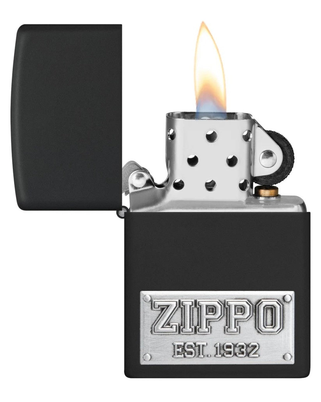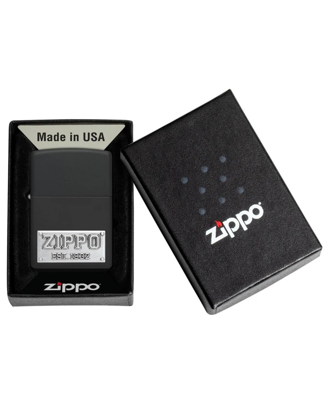 Grab this Black Matte lighter before you hit the open road. The sleek chrome emblem mimics a license plate featuring your favorite brand and our founding year. Comes packaged in a gift box. For optimal performance, fill with Zippo lighter fuel. Genuine Zippo windproof lighter with distinctive Zippo "click" All-metal...