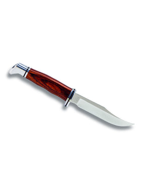 The classic 102 Woodsman® is a true hunting knife, designed with a fine clip blade perfect for fish and small game. Features include full tang construction, a finger guard integrated into the blade, thumb grip ridges, and a deep choil. Overall length: 7 3/4" (19.7 cm). Includes a genuine, leather sheath. Imported sheath.