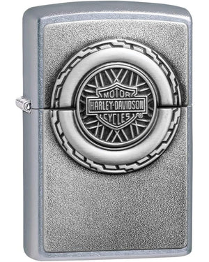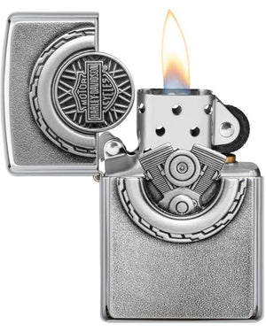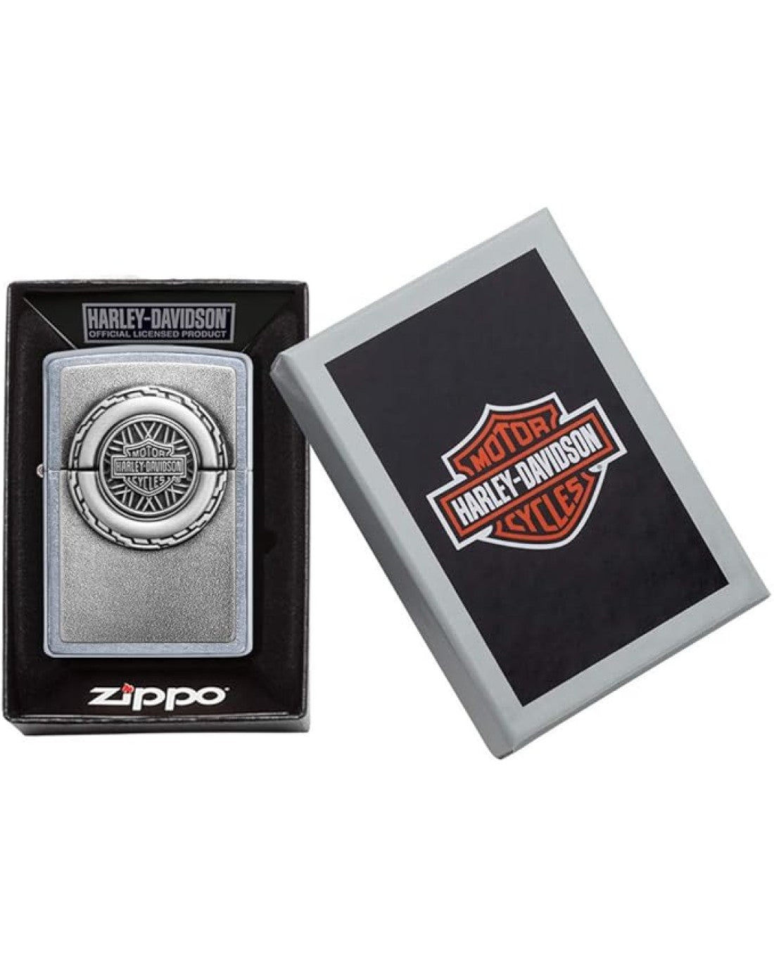 Ride in style, with this Harley-Davidson inspired design. This Street Chrome lighter features an attached emblem of a motorcycle wheel, with the Harley-Davidson logo in the center of the spokes. Flip the lid to expose the iconic Harley-Davidson Evo engine surprise emblem. This lighter is the perfect gift for any motor head! Comes packaged in a gift box. For optimum performance, fill with Zippo lighter fuel.