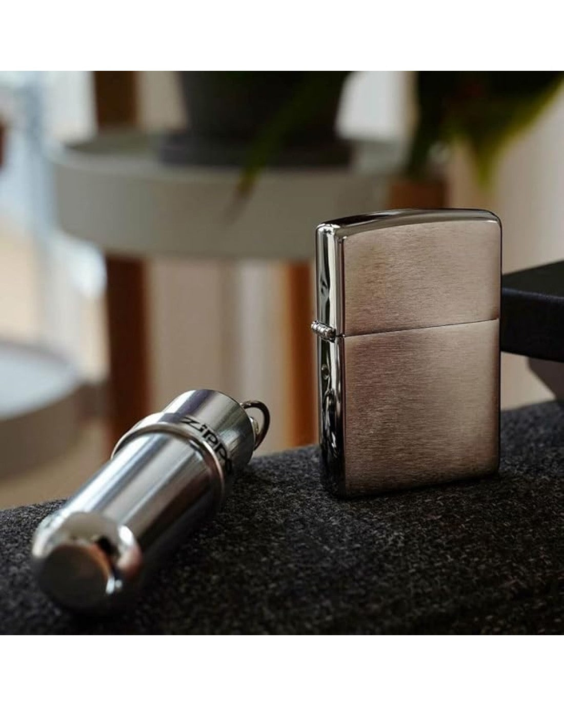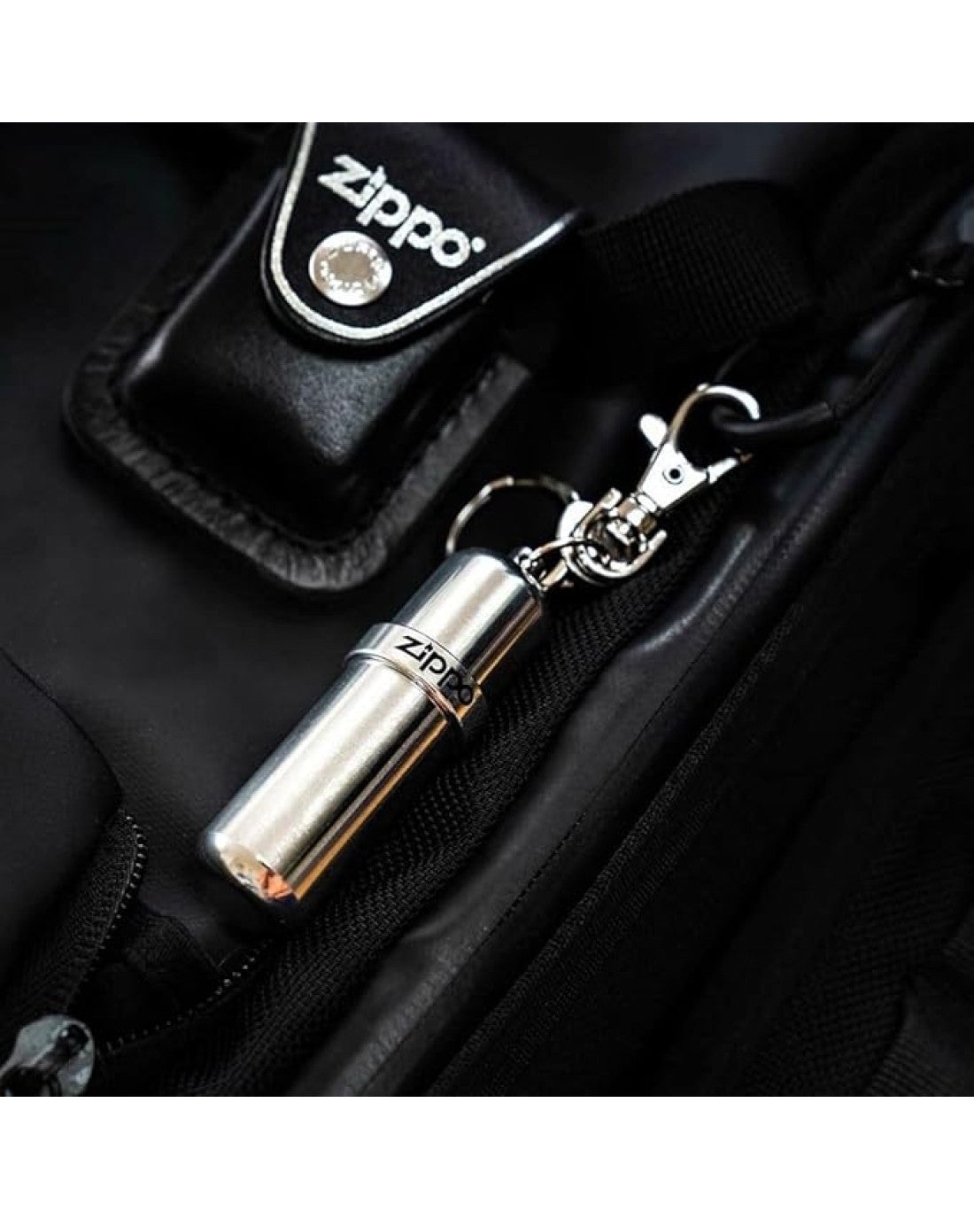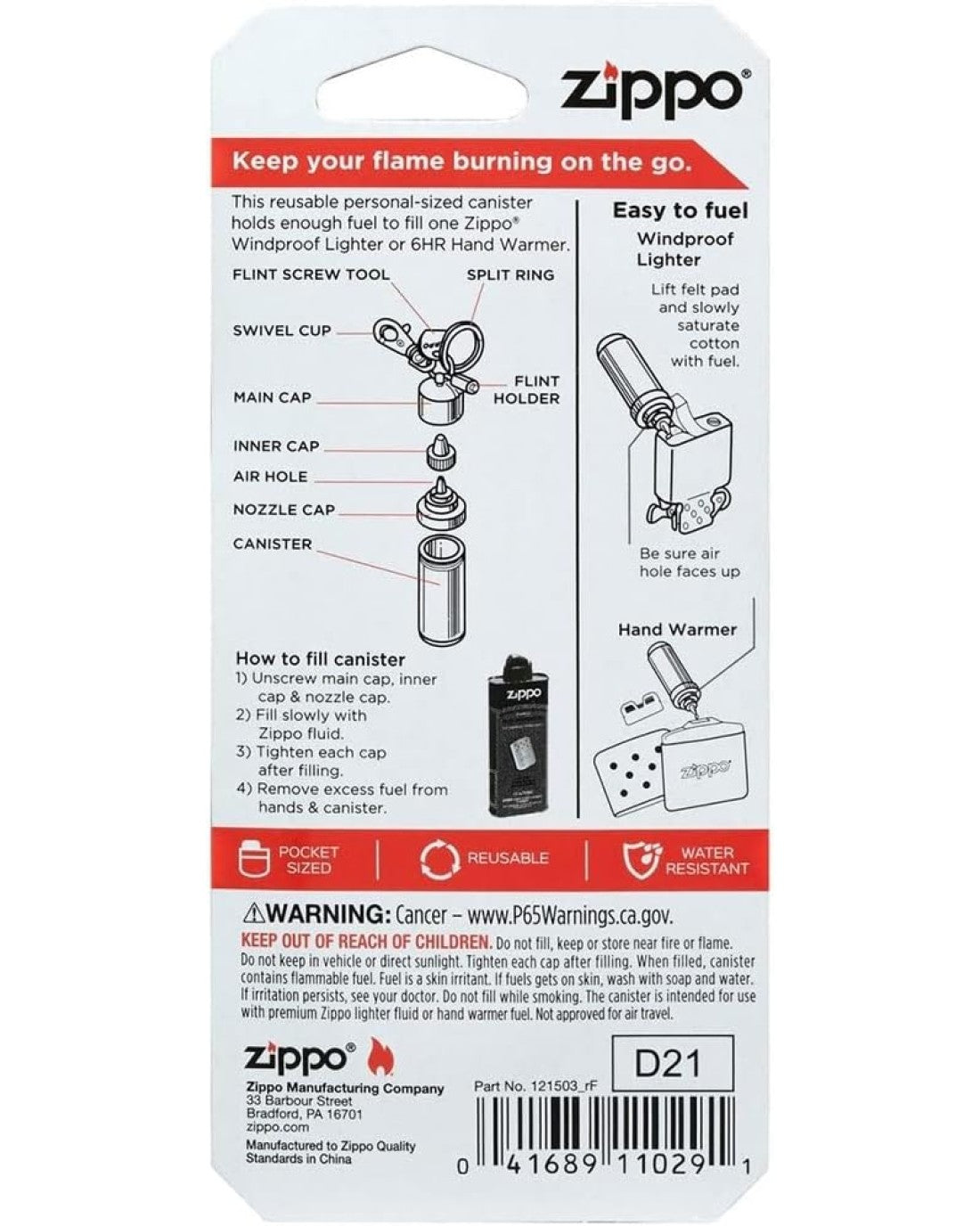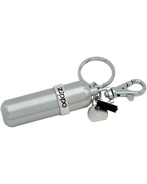 Take along an extra refill of Zippo premium lighter fluid. Reusable personal-sized aluminum canister holds enough fuel to fill one Zippo lighter.Includes swivel snap fastener.Split ring for keys. Disk to tighten and loosen flint screw.Rubber storage sleeve for 2 extra Zippo flints.NOTE: Can not be taken on airplane.