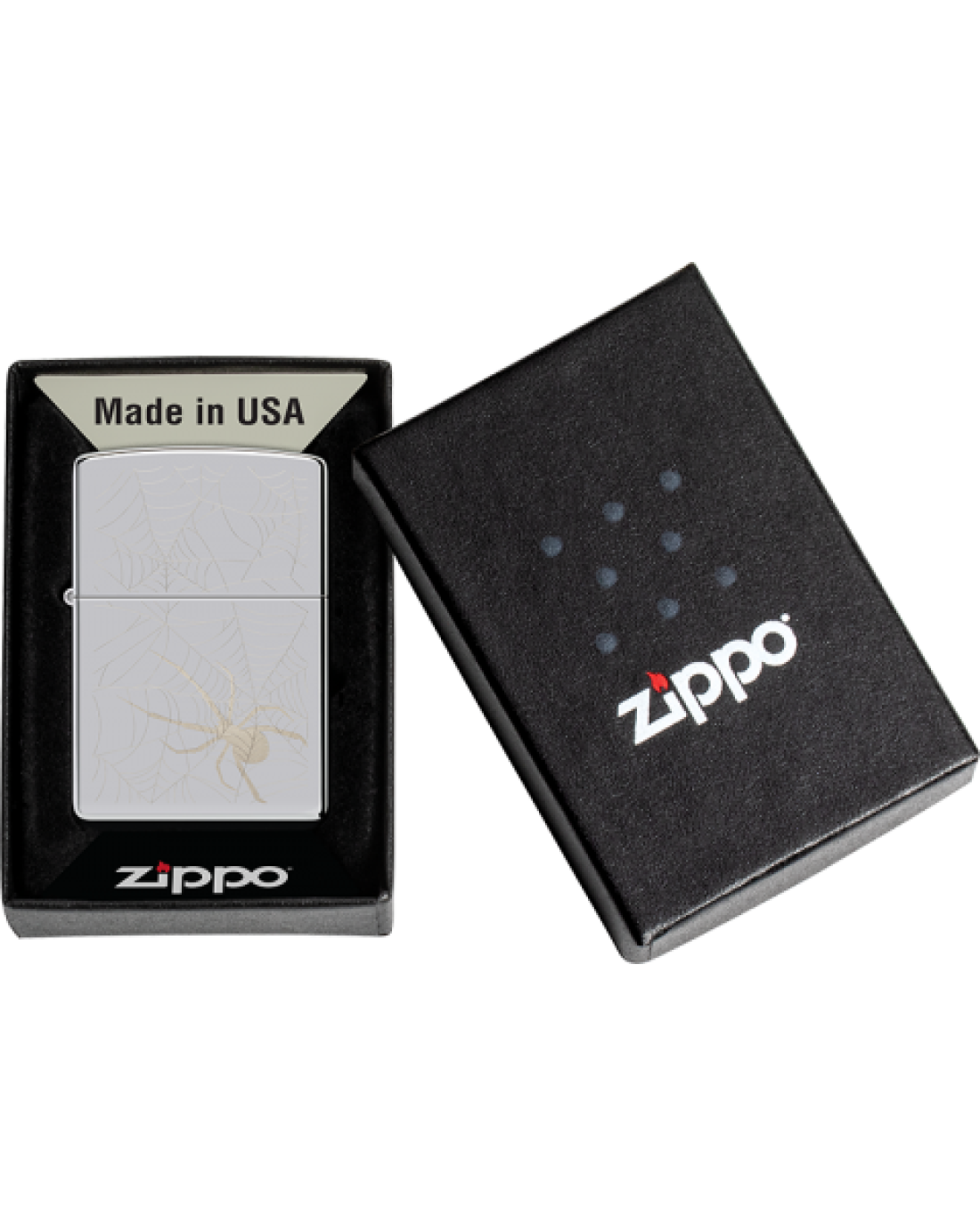 A watchful spider guards its web on this classic High Polish Chrome lighter. The Laser Engrave spider lurks behind its intricate Auto Engrave web, lending creepy-crawly contrast to the eerie design. Comes packaged in a gift box. For optimal performance, fill with Zippo lighter fuel. Finish: High Polish Chrome All-metal...